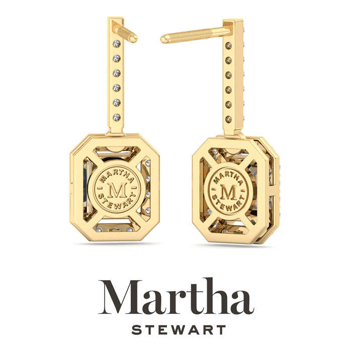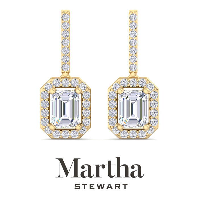 Showcasing class, style and timeless sophistication, the Martha Stewart fine jewelry collection is here to be celebrated. These Martha Stewart lab grown diamond earrings feature 50 round shape lab grown diamonds in G-H color, VS clarity and two 1 carat emerald cut lab grown diamonds. Total carat weight is 2 1/2 carats. These earrings are in 14 karat yellow gold and have post with screw backs. These earrings dangle down 1 inch! Whether worn for a special event or to enhance everyday elegance, these earrings are sure to become cherished heirlooms. Martha Stewart’s attention to detail and dedication to quality shine through in every piece, making this collection a celebration of refined craftsmanship and timeless beauty.