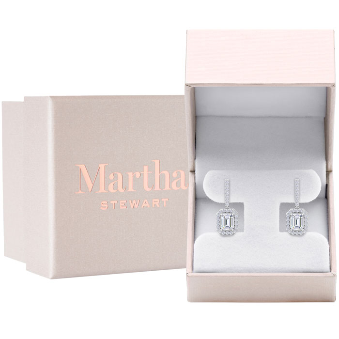 Showcasing class, style and timeless sophistication, the Martha Stewart fine jewelry collection is here to be celebrated. These Martha Stewart lab grown diamond earrings feature 50 round shape lab grown diamonds in G-H color, VS clarity and two 1 carat emerald cut lab grown diamonds. Total carat weight is 2 1/2 carats. These earrings are in Sterling Silver and have post with screw backs. These earrings dangle down 1 inch! Whether worn for a special event or to enhance everyday elegance, these earrings are sure to become cherished heirlooms. Martha Stewart’s attention to detail and dedication to quality shine through in every piece, making this collection a celebration of refined craftsmanship and timeless beauty.