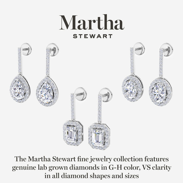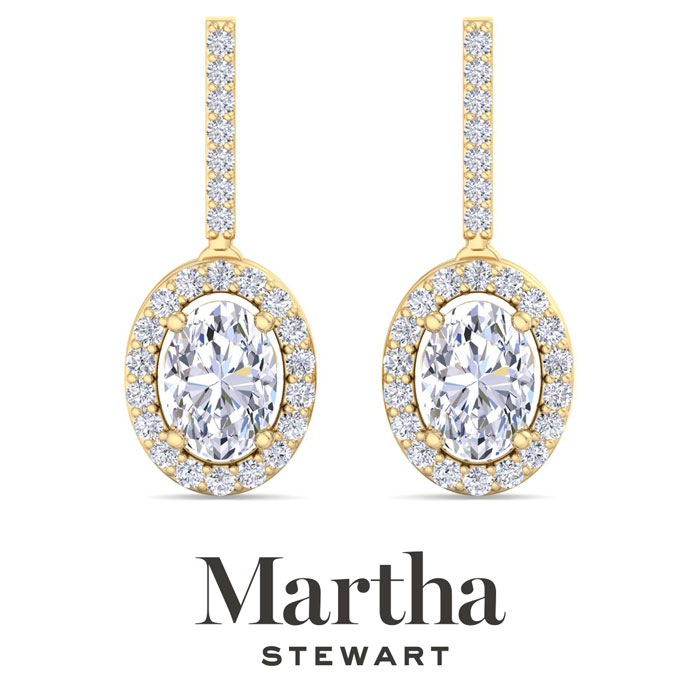 Showcasing class, style and timeless sophistication, the Martha Stewart fine jewelry collection is here to be celebrated. These Martha Stewart lab grown diamond earrings feature 50 round shape lab grown diamonds in G-H color, VS clarity and two 1 carat oval shape lab grown diamonds. Total carat weight is 2 1/2 carats. These earrings are in 14 karat yellow gold and have post with screw backs. These earrings dangle down 1 inch! Whether worn for a special event or to enhance everyday elegance, these earrings are sure to become cherished heirlooms. Martha Stewart’s attention to detail and dedication to quality shine through in every piece, making this collection a celebration of refined craftsmanship and timeless beauty.