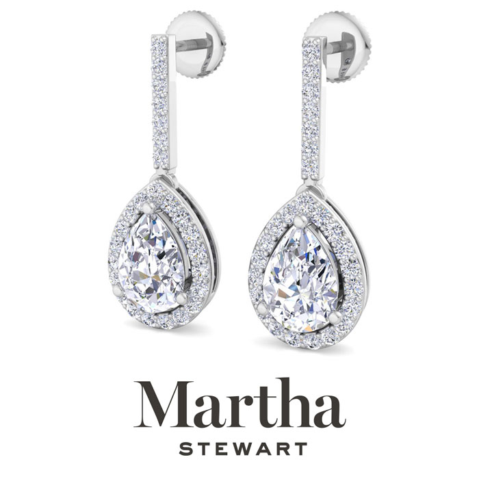 Showcasing class, style and timeless sophistication, the Martha Stewart fine jewelry collection is here to be celebrated. These Martha Stewart lab grown diamond earrings feature 52 round shape lab grown diamonds in G-H color, VS clarity and two 1 carat pear shape lab grown diamonds. Total carat weight is 2 1/2 carats. These earrings are in Sterling Silver and have post with screw backs. These earrings dangle down 1 inch! Whether worn for a special event or to enhance everyday elegance, these earrings are sure to become cherished heirlooms. Martha Stewart’s attention to detail and dedication to quality shine through in every piece, making this collection a celebration of refined craftsmanship and timeless beauty.