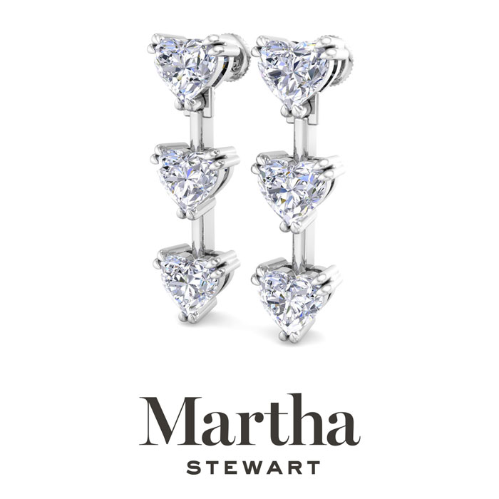 Showcasing class, style and timeless sophistication, the Martha Stewart fine jewelry collection is here to be celebrated. These Martha Stewart lab grown diamond earrings feature six heart shape lab grown diamonds in G-H color, VS clarity. Total carat weight is 3 carats. These earrings are in Sterling Silver and have post with screw backs. These earrings are set in the signature Martha Stewart double-prong setting and dangle down 1 inch! Whether worn for a special event or to enhance everyday elegance, these earrings are sure to become cherished heirlooms. Martha Stewart’s attention to detail and dedication to quality shine through in every piece, making this collection a celebration of refined craftsmanship and timeless beauty.
