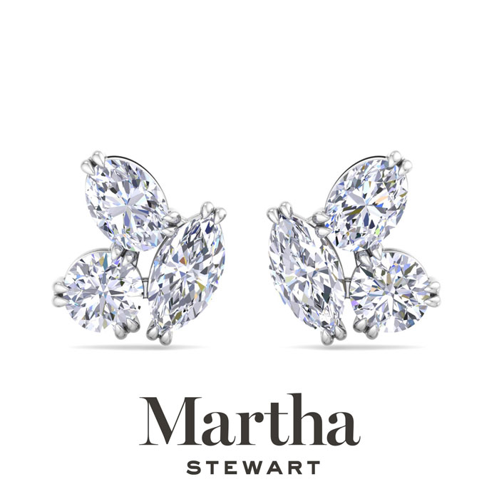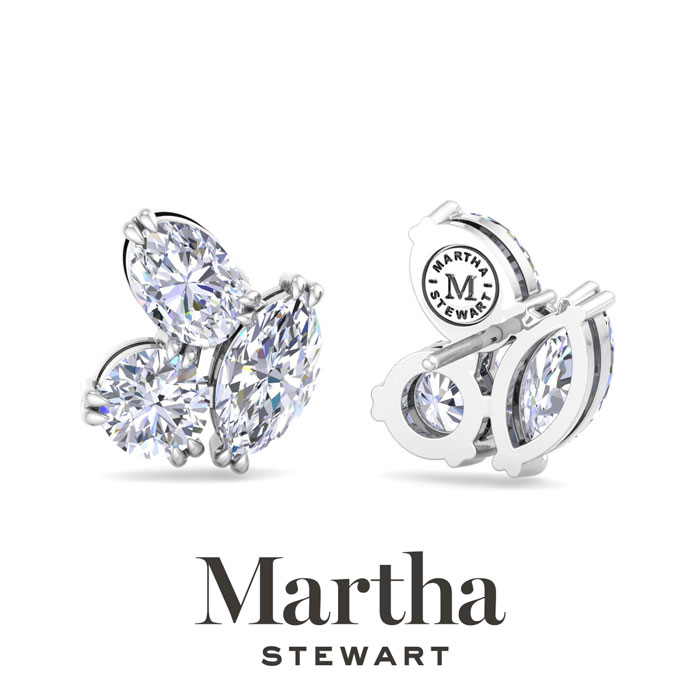 Showcasing class, style and timeless sophistication, the Martha Stewart fine jewelry collection is here to be celebrated. These Martha Stewart lab grown diamond earrings feature two marquise, two round and two oval shape lab grown diamonds in G-H color, VS clarity. Total carat weight is 3 carats. These earrings are in 14 karat white gold and have post with screw backs. These earrings are set in the signature Martha Stewart double-prong setting and are 1/2 inch wide! Whether worn for a special event or to enhance everyday elegance, these earrings are sure to become cherished heirlooms. Martha Stewart’s attention to detail and dedication to quality shine through in every piece, making this collection a celebration of refined craftsmanship and timeless beauty.
