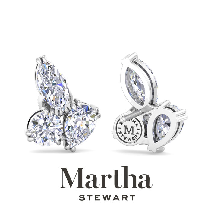 Showcasing class, style and timeless sophistication, the Martha Stewart fine jewelry collection is here to be celebrated. These Martha Stewart lab grown diamond earrings feature two marquise, two round and two pear shape lab grown diamonds in G-H color, VS clarity. Total carat weight is 3 carats. These earrings are in 14 karat white gold and have post with screw backs. These earrings are set in the signature Martha Stewart double-prong setting and are 1/2 inch wide! Whether worn for a special event or to enhance everyday elegance, these earrings are sure to become cherished heirlooms. Martha Stewart’s attention to detail and dedication to quality shine through in every piece, making this collection a celebration of refined craftsmanship and timeless beauty.