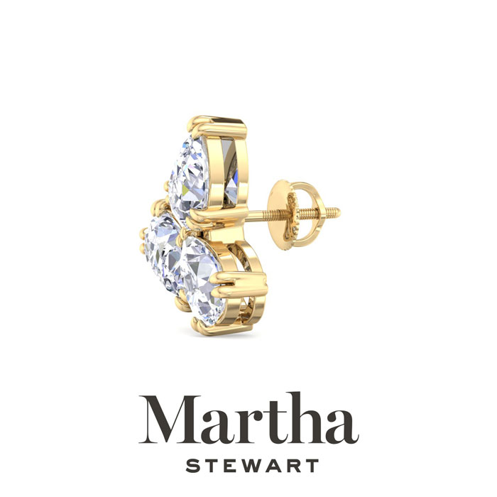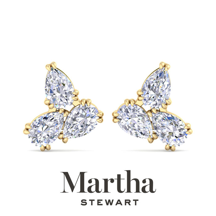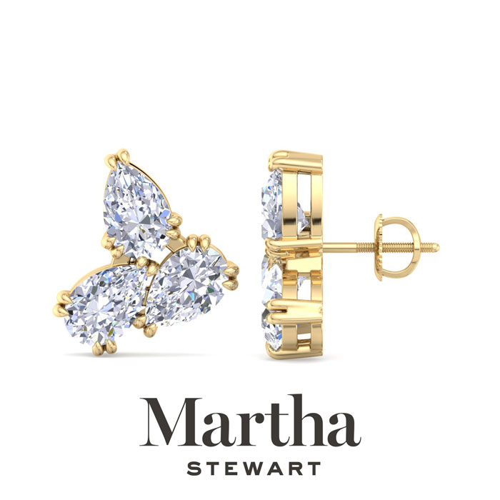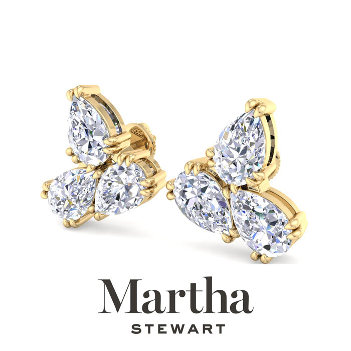 Showcasing class, style and timeless sophistication, the Martha Stewart fine jewelry collection is here to be celebrated. These Martha Stewart lab grown diamond earrings feature six pear shape lab grown diamonds in G-H color, VS clarity. Total carat weight is 3 carats. These earrings are in 14 karat yellow gold and have post with screw backs. These earrings are set in the signature Martha Stewart double-prong setting and are 1/2 inch wide! Whether worn for a special event or to enhance everyday elegance, these earrings are sure to become cherished heirlooms. Martha Stewart’s attention to detail and dedication to quality shine through in every piece, making this collection a celebration of refined craftsmanship and timeless beauty.