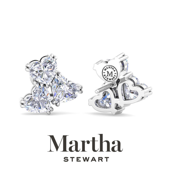 Showcasing class, style and timeless sophistication, the Martha Stewart fine jewelry collection is here to be celebrated. These Martha Stewart lab grown diamond earrings feature six heart shape lab grown diamonds in G-H color, VS clarity. Total carat weight is 3 carats. These earrings are in Sterling Silver and have post with screw backs. These earrings are set in the signature Martha Stewart double-prong setting and are 1/2 inch wide! Whether worn for a special event or to enhance everyday elegance, these earrings are sure to become cherished heirlooms. Martha Stewart’s attention to detail and dedication to quality shine through in every piece, making this collection a celebration of refined craftsmanship and timeless beauty.