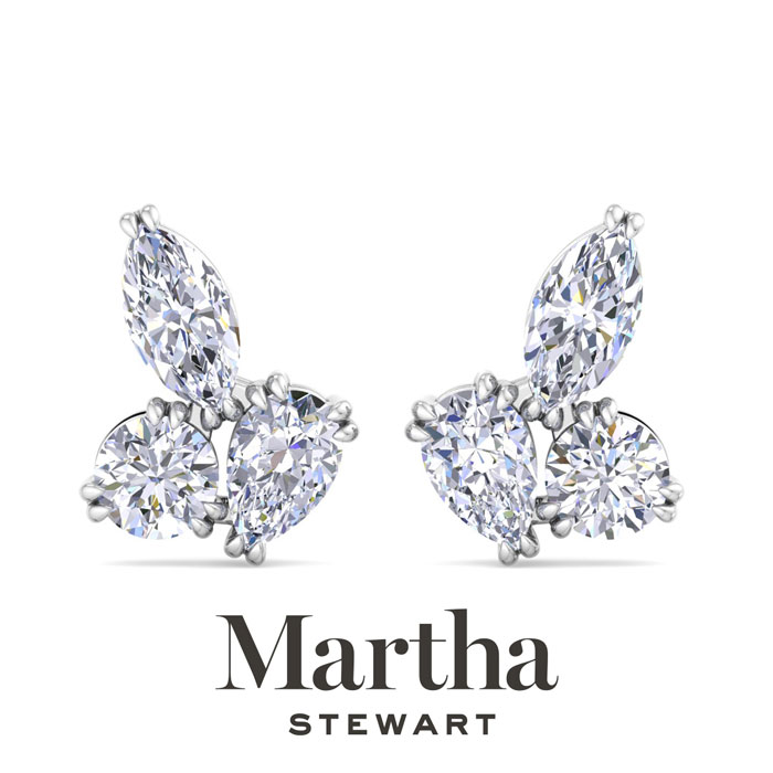 Showcasing class, style and timeless sophistication, the Martha Stewart fine jewelry collection is here to be celebrated. These Martha Stewart lab grown diamond earrings feature two marquise, two round and two pear shape lab grown diamonds in G-H color, VS clarity. Total carat weight is 3 carats. These earrings are in Sterling Silver and have post with screw backs. These earrings are set in the signature Martha Stewart double-prong setting and are 1/2 inch wide! Whether worn for a special event or to enhance everyday elegance, these earrings are sure to become cherished heirlooms. Martha Stewart’s attention to detail and dedication to quality shine through in every piece, making this collection a celebration of refined craftsmanship and timeless beauty.