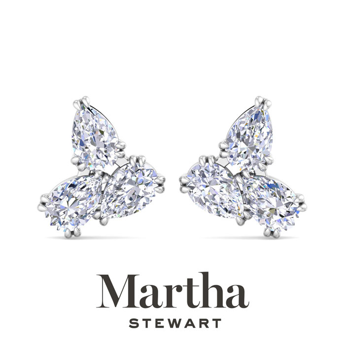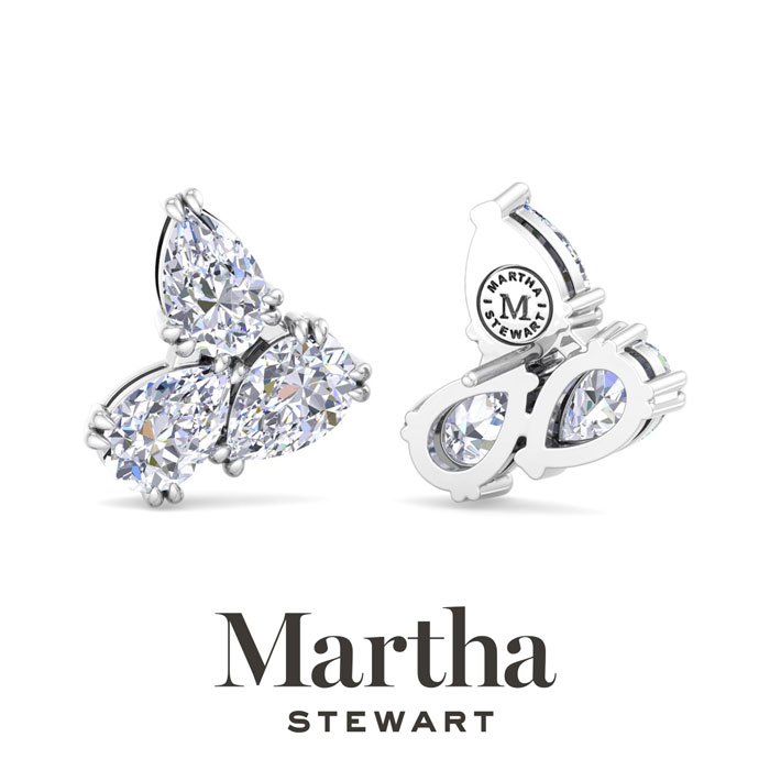 Showcasing class, style and timeless sophistication, the Martha Stewart fine jewelry collection is here to be celebrated. These Martha Stewart lab grown diamond earrings feature six pear shape lab grown diamonds in G-H color, VS clarity. Total carat weight is 3 carats. These earrings are in Sterling Silver and have post with screw backs. These earrings are set in the signature Martha Stewart double-prong setting and are 1/2 inch wide! Whether worn for a special event or to enhance everyday elegance, these earrings are sure to become cherished heirlooms. Martha Stewart’s attention to detail and dedication to quality shine through in every piece, making this collection a celebration of refined craftsmanship and timeless beauty.