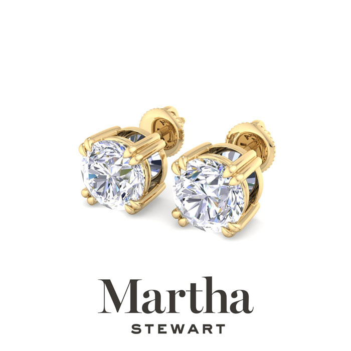 Showcasing class, style and timeless sophistication, the Martha Stewart fine jewelry collection is here to be celebrated. These Martha Stewart lab grown diamond earrings feature two 1 1/2 carat lab grown diamonds in G-H color, VS clarity. Total carat weight is 3 carats. These earrings are in 14 karat yellow gold and are in a basket setting with screwbacks. These earrings are set in the signature Martha Stewart double-prong setting. Whether worn for a special event or to enhance everyday elegance, these earrings are sure to become cherished heirlooms. Martha Stewart’s attention to detail and dedication to quality shine through in every piece, making this collection a celebration of refined craftsmanship and timeless beauty.