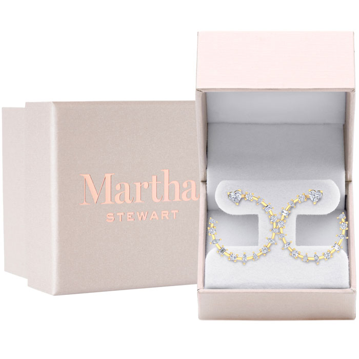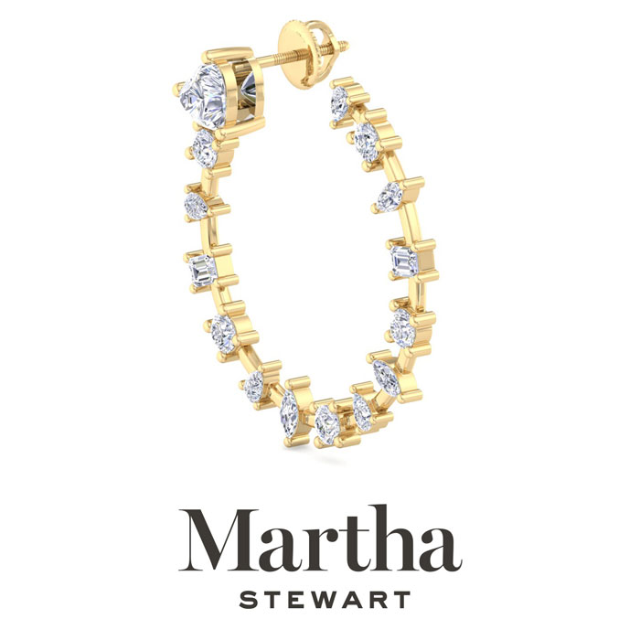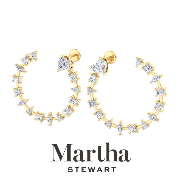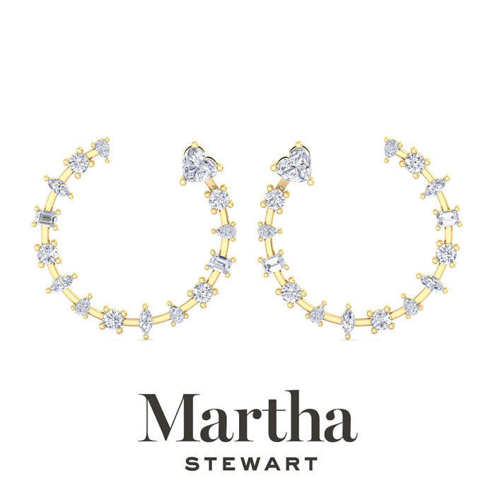Showcasing class, style and timeless sophistication, the Martha Stewart fine jewelry collection is here to be celebrated. These Martha Stewart lab grown diamond earrings feature 30 emerald, pear, round, marquise and heart shape lab grown diamonds in G-H color, VS clarity. Total carat weight is 3 carats. These earrings are in 14 karat yellow gold and have post with screw backs. These earrings are 1 inch in diameter! Whether worn for a special event or to enhance everyday elegance, these earrings are sure to become cherished heirlooms. Martha Stewart’s attention to detail and dedication to quality shine through in every piece, making this collection a celebration of refined craftsmanship and timeless beauty.