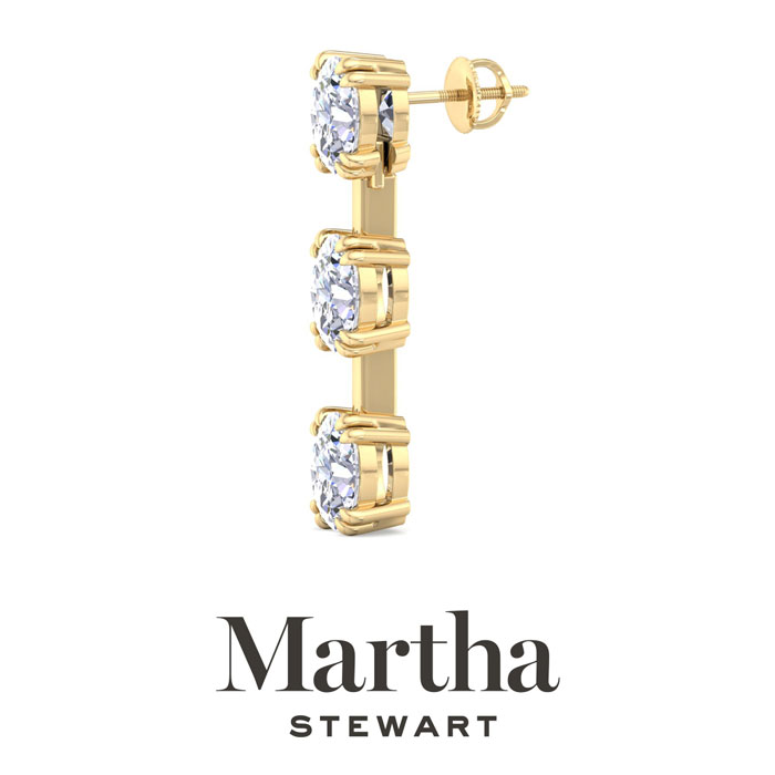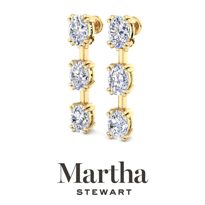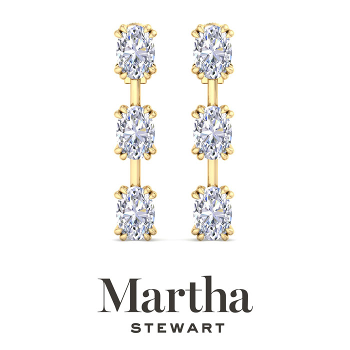 Showcasing class, style and timeless sophistication, the Martha Stewart fine jewelry collection is here to be celebrated. These Martha Stewart lab grown diamond earrings feature six oval shape lab grown diamonds in G-H color, VS clarity. Total carat weight is 3 carats. These earrings are in 14 karat yellow gold and have post with screw backs. These earrings are set in the signature Martha Stewart double-prong setting and dangle down 1 inch! Whether worn for a special event or to enhance everyday elegance, these earrings are sure to become cherished heirlooms. Martha Stewart’s attention to detail and dedication to quality shine through in every piece, making this collection a celebration of refined craftsmanship and timeless beauty.