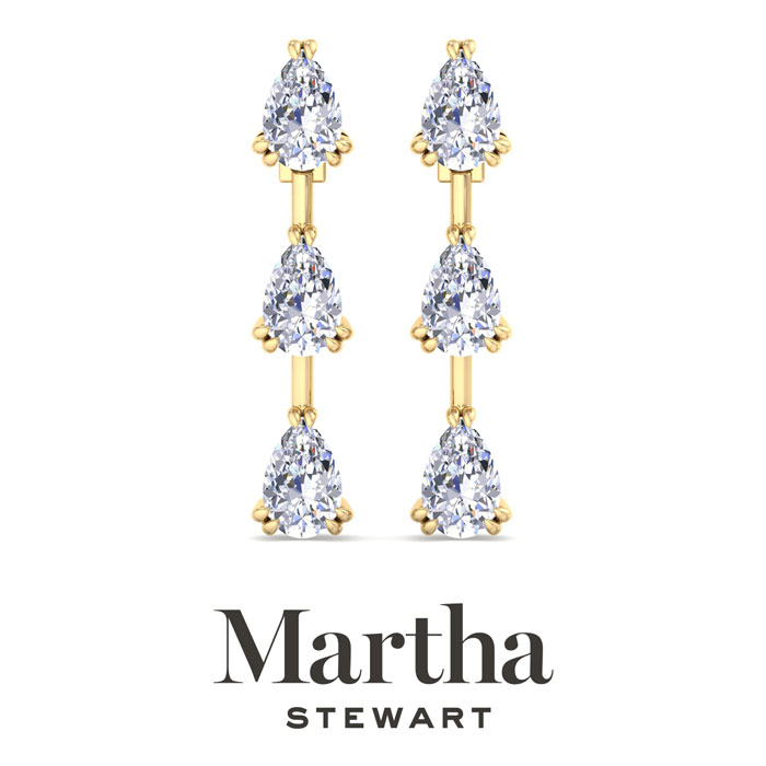 Showcasing class, style and timeless sophistication, the Martha Stewart fine jewelry collection is here to be celebrated. These Martha Stewart lab grown diamond earrings feature six pear shape lab grown diamonds in G-H color, VS clarity. Total carat weight is 3 carats. These earrings are in 14 karat yellow gold and have post with screw backs. These earrings are set in the signature Martha Stewart double-prong setting and dangle down over 1 inch! Whether worn for a special event or to enhance everyday elegance, these earrings are sure to become cherished heirlooms. Martha Stewart’s attention to detail and dedication to quality shine through in every piece, making this collection a celebration of refined craftsmanship and timeless beauty.