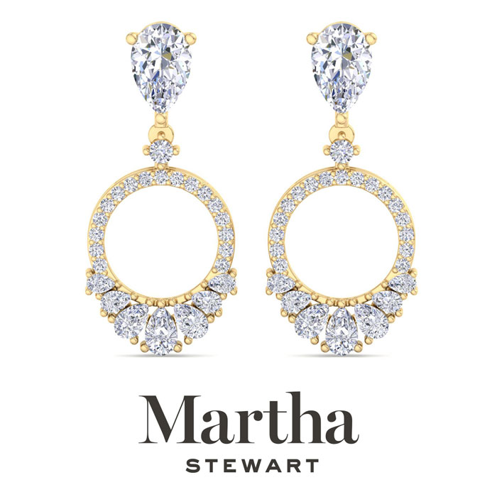 Showcasing class, style and timeless sophistication, the Martha Stewart fine jewelry collection is here to be celebrated. These Martha Stewart lab grown diamond earrings feature 36 round shape lab grown diamonds in G-H color, VS clarity and 16 pear shape lab grown diamonds including two 1 carat diamonds. Total carat weight is 2 carats. These earrings are in 14 karat yellow gold and have post with screw backs. These earrings dangle down 1 1/4 inches! Whether worn for a special event or to enhance everyday elegance, these earrings are sure to become cherished heirlooms. Martha Stewart’s attention to detail and dedication to quality shine through in every piece, making this collection a celebration of refined craftsmanship and timeless beauty.