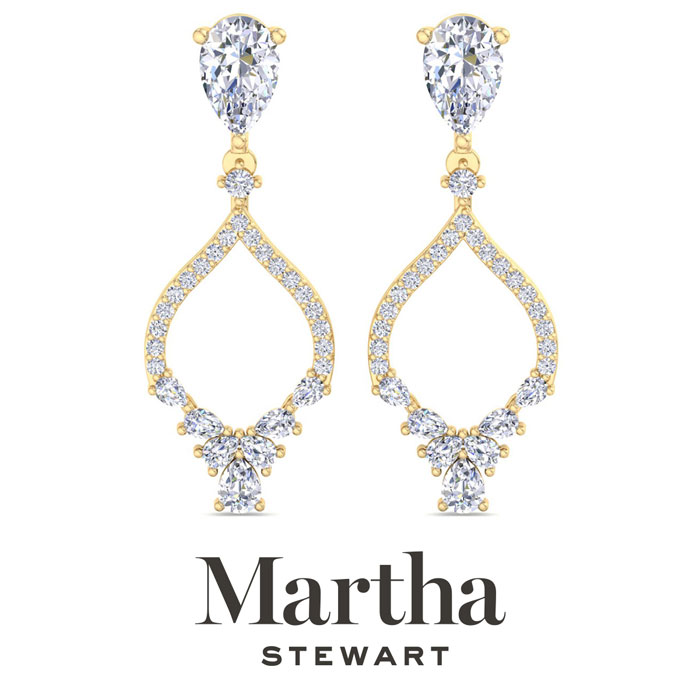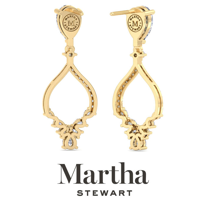 Showcasing class, style and timeless sophistication, the Martha Stewart fine jewelry collection is here to be celebrated. These Martha Stewart lab grown diamond earrings feature 40 round shape lab grown diamonds in G-H color, VS clarity and 16 pear shape lab grown diamonds including two 1 carat diamonds. Total carat weight is 2 carats. These earrings are in 14 karat yellow gold and have post with screw backs. These earrings dangle down 1 1/4 inches! Whether worn for a special event or to enhance everyday elegance, these earrings are sure to become cherished heirlooms. Martha Stewart’s attention to detail and dedication to quality shine through in every piece, making this collection a celebration of refined craftsmanship and timeless beauty.