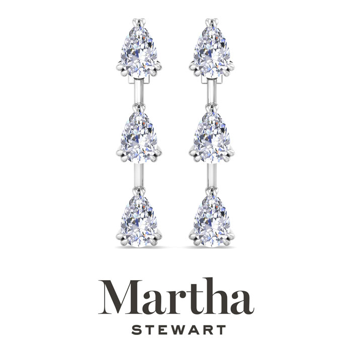 Showcasing class, style and timeless sophistication, the Martha Stewart fine jewelry collection is here to be celebrated. These Martha Stewart lab grown diamond earrings feature six pear shape lab grown diamonds in G-H color, VS clarity. Total carat weight is 3 carats. These earrings are in Sterling Silver and have post with screw backs. These earrings are set in the signature Martha Stewart double-prong setting and dangle down over 1 inch! Whether worn for a special event or to enhance everyday elegance, these earrings are sure to become cherished heirlooms. Martha Stewart’s attention to detail and dedication to quality shine through in every piece, making this collection a celebration of refined craftsmanship and timeless beauty.
