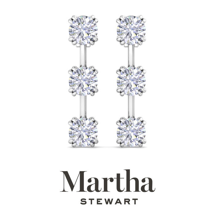 Showcasing class, style and timeless sophistication, the Martha Stewart fine jewelry collection is here to be celebrated. These Martha Stewart lab grown diamond earrings feature six round shape lab grown diamonds in G-H color, VS clarity. Total carat weight is 3 carats. These earrings are in Sterling Silver and have post with screw backs. These earrings are set in the signature Martha Stewart double-prong setting and dangle down 1 inch! Whether worn for a special event or to enhance everyday elegance, these earrings are sure to become cherished heirlooms. Martha Stewart’s attention to detail and dedication to quality shine through in every piece, making this collection a celebration of refined craftsmanship and timeless beauty.