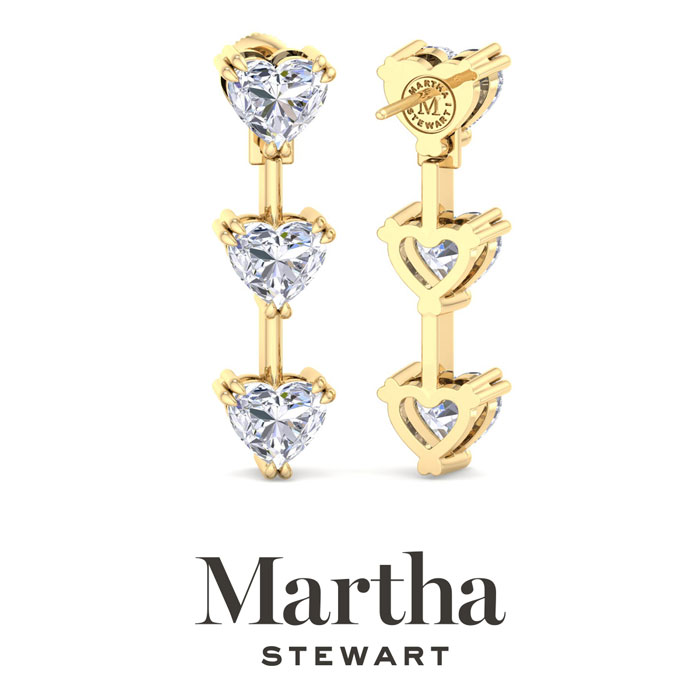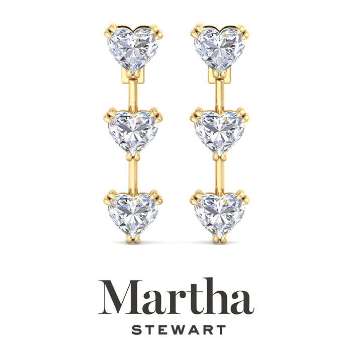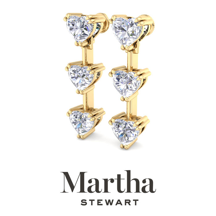 Showcasing class, style and timeless sophistication, the Martha Stewart fine jewelry collection is here to be celebrated. These Martha Stewart lab grown diamond earrings feature six heart shape lab grown diamonds in G-H color, VS clarity. Total carat weight is 5 carats. These earrings are in 14 karat yellow gold and have post with screw backs. These earrings are set in the signature Martha Stewart double-prong setting and dangle down over 1 inch! Whether worn for a special event or to enhance everyday elegance, these earrings are sure to become cherished heirlooms. Martha Stewart’s attention to detail and dedication to quality shine through in every piece, making this collection a celebration of refined craftsmanship and timeless beauty.