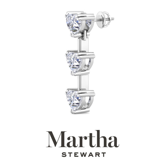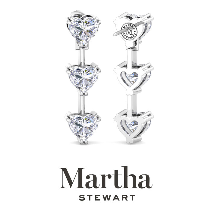 Showcasing class, style and timeless sophistication, the Martha Stewart fine jewelry collection is here to be celebrated. These Martha Stewart lab grown diamond earrings feature six heart shape lab grown diamonds in G-H color, VS clarity. Total carat weight is 5 carats. These earrings are in Sterling Silver and have post with screw backs. These earrings are set in the signature Martha Stewart double-prong setting and dangle down over 1 inch! Whether worn for a special event or to enhance everyday elegance, these earrings are sure to become cherished heirlooms. Martha Stewart’s attention to detail and dedication to quality shine through in every piece, making this collection a celebration of refined craftsmanship and timeless beauty.