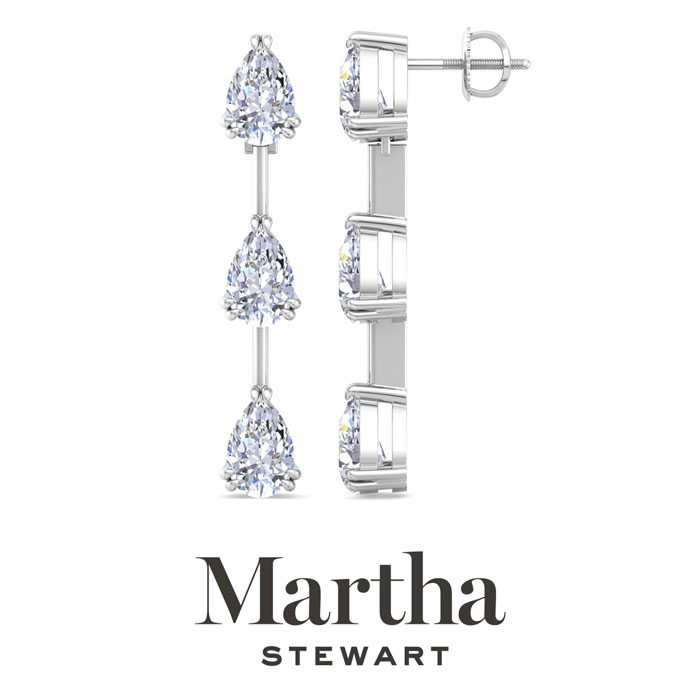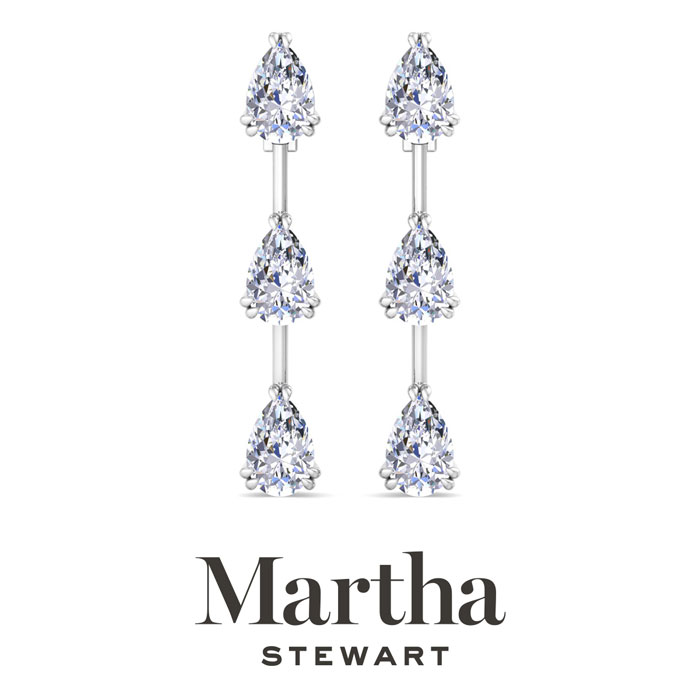 Showcasing class, style and timeless sophistication, the Martha Stewart fine jewelry collection is here to be celebrated. These Martha Stewart lab grown diamond earrings feature six pear shape lab grown diamonds in G-H color, VS clarity. Total carat weight is 5 carats. These earrings are in 14 karat white gold and have post with screw backs. These earrings are set in the signature Martha Stewart double-prong setting and dangle down over 1 1/2 inches! Whether worn for a special event or to enhance everyday elegance, these earrings are sure to become cherished heirlooms. Martha Stewart’s attention to detail and dedication to quality shine through in every piece, making this collection a celebration of refined craftsmanship and timeless beauty.