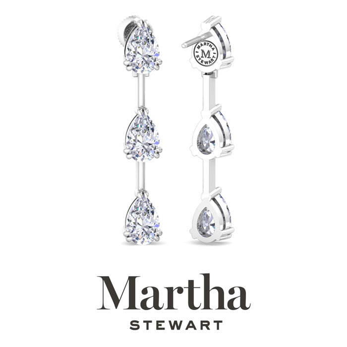 Showcasing class, style and timeless sophistication, the Martha Stewart fine jewelry collection is here to be celebrated. These Martha Stewart lab grown diamond earrings feature six pear shape lab grown diamonds in G-H color, VS clarity. Total carat weight is 5 carats. These earrings are in Sterling Silver and have post with screw backs. These earrings are set in the signature Martha Stewart double-prong setting and dangle down over 1 1/2 inches! Whether worn for a special event or to enhance everyday elegance, these earrings are sure to become cherished heirlooms. Martha Stewart’s attention to detail and dedication to quality shine through in every piece, making this collection a celebration of refined craftsmanship and timeless beauty.