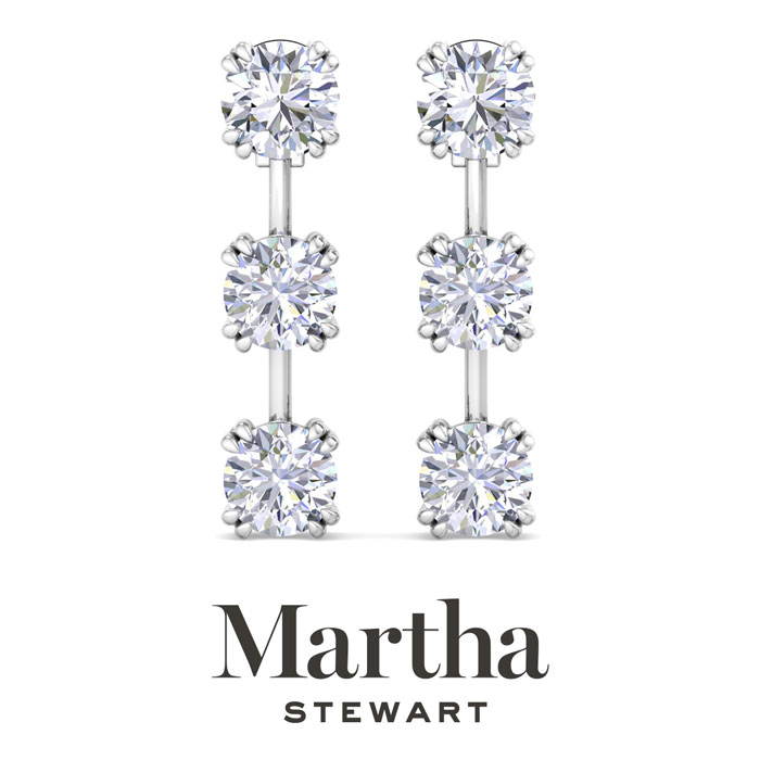 Showcasing class, style and timeless sophistication, the Martha Stewart fine jewelry collection is here to be celebrated. These Martha Stewart lab grown diamond earrings feature six round shape lab grown diamonds in G-H color, VS clarity. Total carat weight is 5 carats. These earrings are in 14 karat white gold and have post with screw backs. These earrings are set in the signature Martha Stewart double-prong setting and dangle down over 1 inch! Whether worn for a special event or to enhance everyday elegance, these earrings are sure to become cherished heirlooms. Martha Stewart’s attention to detail and dedication to quality shine through in every piece, making this collection a celebration of refined craftsmanship and timeless beauty.