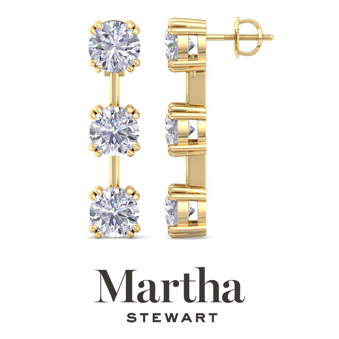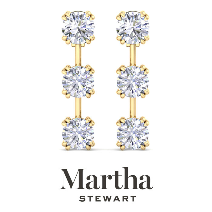 Showcasing class, style and timeless sophistication, the Martha Stewart fine jewelry collection is here to be celebrated. These Martha Stewart lab grown diamond earrings feature six round shape lab grown diamonds in G-H color, VS clarity. Total carat weight is 5 carats. These earrings are in 14 karat yellow gold and have post with screw backs. These earrings are set in the signature Martha Stewart double-prong setting and dangle down over 1 inch! Whether worn for a special event or to enhance everyday elegance, these earrings are sure to become cherished heirlooms. Martha Stewart’s attention to detail and dedication to quality shine through in every piece, making this collection a celebration of refined craftsmanship and timeless beauty.