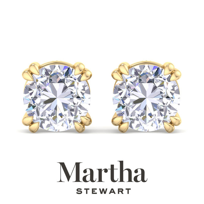 Showcasing class, style and timeless sophistication, the Martha Stewart fine jewelry collection is here to be celebrated. These Martha Stewart lab grown diamond earrings feature two 4 carat lab grown diamonds in G-H color, VS clarity. Total carat weight is 8 carats. These earrings are in 14 karat yellow gold and are in a basket setting with screwbacks. These earrings are set in the signature Martha Stewart double-prong setting. Whether worn for a special event or to enhance everyday elegance, these earrings are sure to become cherished heirlooms. Martha Stewart’s attention to detail and dedication to quality shine through in every piece, making this collection a celebration of refined craftsmanship and timeless beauty.