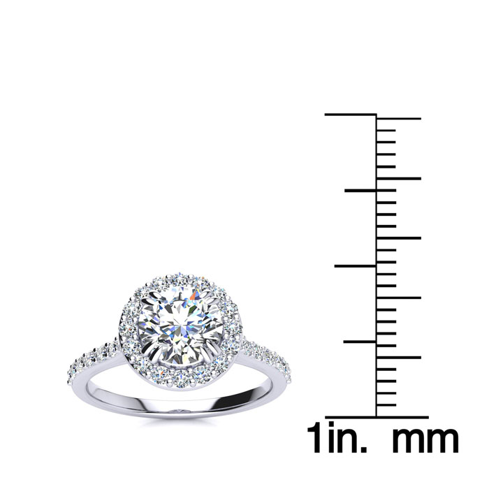 This lab grown diamond engagement ring features one 1 carat center lab grown diamond in G-H color, VS clarity. It is surrounded by 30 lab grown diamonds totaling 1/4 carat. Total carat weight is 1 1/4 carats. This ring is in sterling silver.