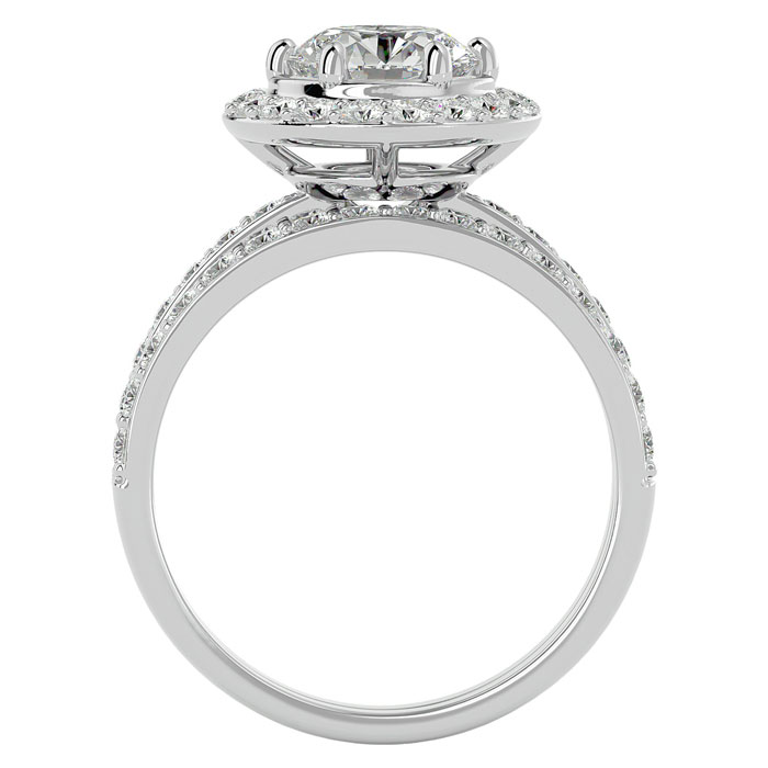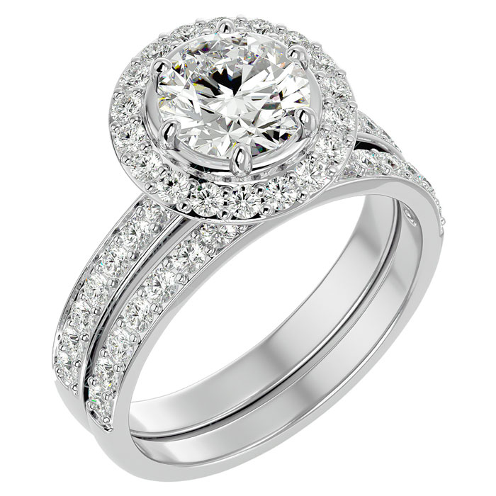 This lab grown diamond bridal set features one 1 1/2 carat center lab grown diamond in G-H color, VS clarity. It is surrounded by 48 lab grown diamonds totaling 1 carat. Total carat weight is 2 1/2 carats. This bridal set is in sterling silver.