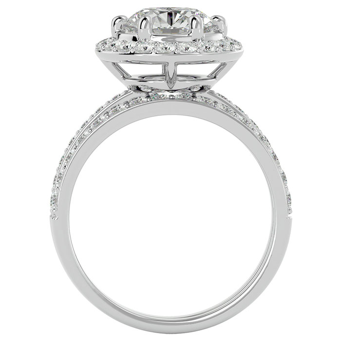 This lab grown diamond bridal set features one 2 carat center lab grown diamond in G-H color, VS clarity. It is surrounded by 49 lab grown diamonds totaling 1 carat. Total carat weight is 3 carats. This bridal set is in sterling silver.