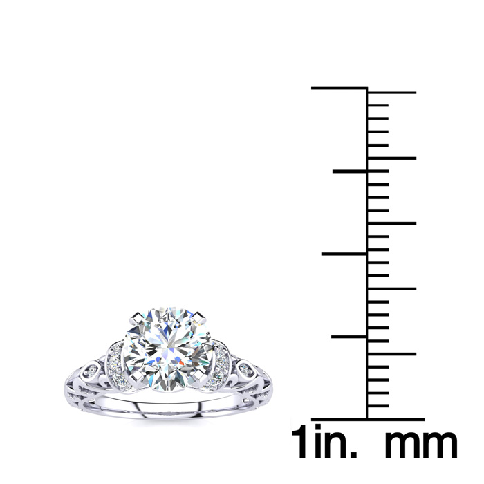 This vintage ring features a sparkling 1 carat center lab grown diamond in G-H color, VS clarity. It is accented with 18 side lab grown diamonds at 1/4 carat. Total carat weight is 1 1/4 carats. This ring is in 14 karat white gold.