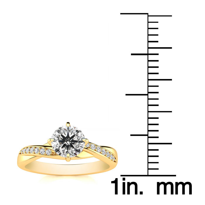 This engagement ring features a sparkling 1/2 carat center lab grown diamond in G-H color, VS clarity. It is accented with 14 side lab grown diamonds at 0.07 carats. Total carat weight is 0.57 carats. This ring is in 14 karat yellow gold.