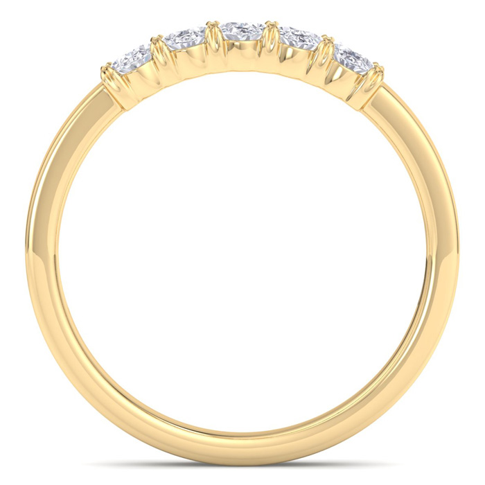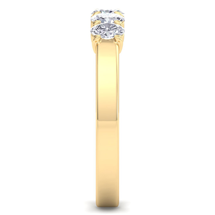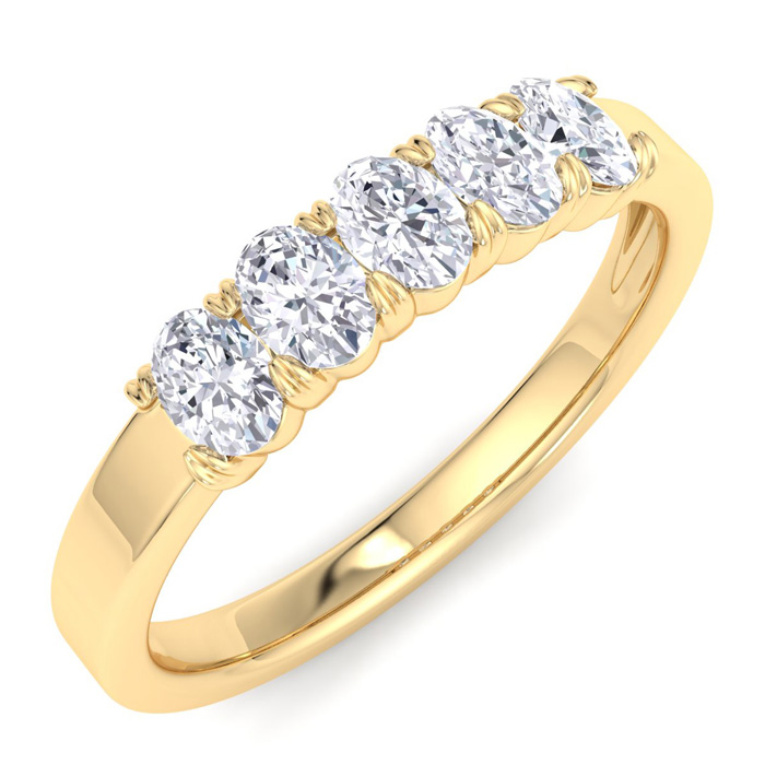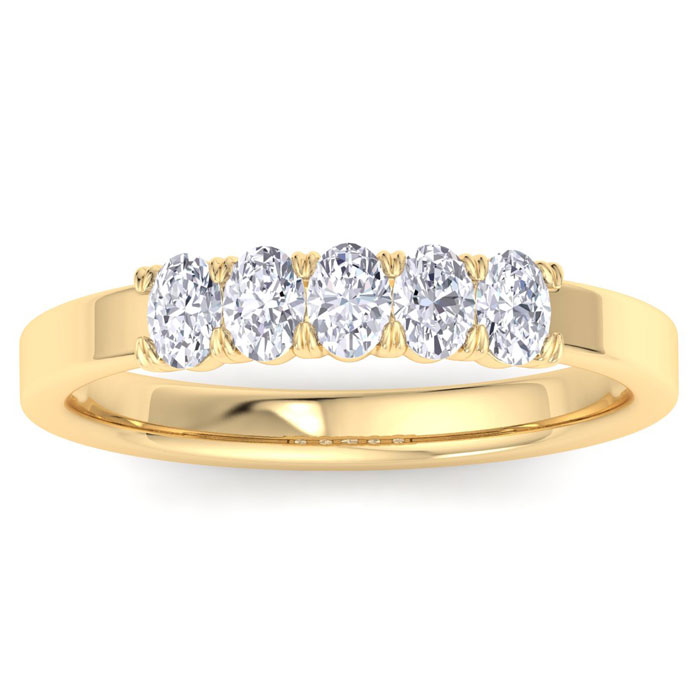 This lab grown diamond engagement ring features five oval shape lab grown diamonds in G-H color, VS clarity. Total carat weight is approximately 1/2 carat. This ring is in 14 karat yellow gold.