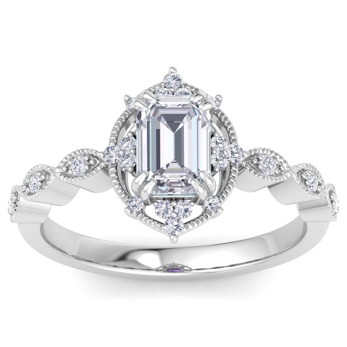 This unique engagement ring features a 3/4 carat octagon shape center lab grown diamond. It is accented with 22 round lab grown diamonds in G-H color, VS clarity. Total carat weight is approximately 1 carat. This ring is in 14 karat white gold.