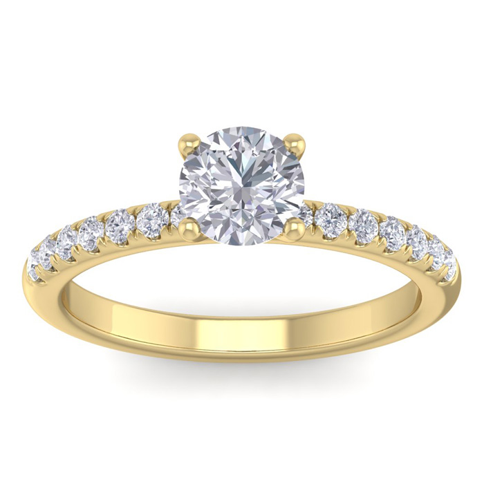 This elegant lab grown diamond engagement ring features a sparkling 3/4 carat center lab grown diamond in G-H color, VS clarity. It is surrounded by 14 side lab grown diamonds totaling 1/4 carat. Total carat weight is 1 carat. This ring is in 14 karat yellow gold.