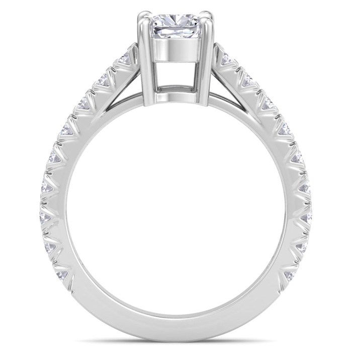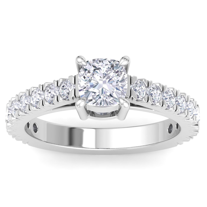 This lab grown diamond engagement ring features a 1 carat cushion cut center lab grown diamond. It is accented with 18 round lab grown diamonds in G-H color, VS clarity. Total carat weight is approximately 2 carats. This ring is in 14 karat white gold.