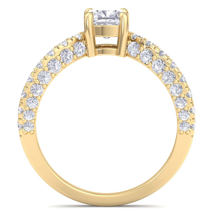 This lab grown diamond engagement ring features a 1 carat cushion cut center lab grown diamond. It is accented with 48 round lab grown diamonds in G-H color, VS clarity. Total carat weight is approximately 2 carats. This ring is in 14 karat yellow gold.