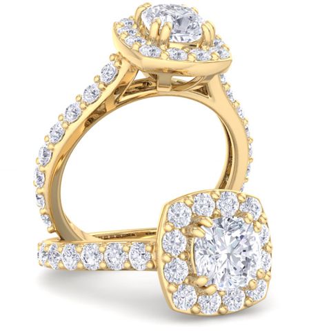 This lab grown diamond engagement ring features a 1 carat cushion cut center lab grown diamond. It is accented with 28 round lab grown diamonds in a halo in G-H color, VS clarity. Total carat weight is approximately 2 carats. This ring is in 14 karat yellow gold.