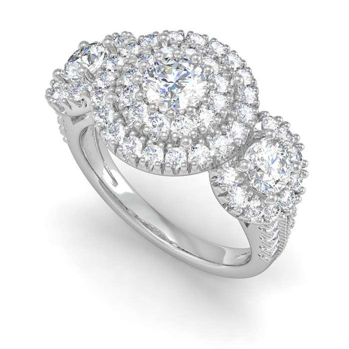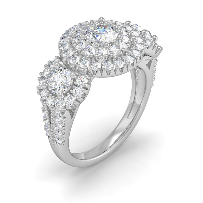 This lab grown diamond engagement ring features a 1/2 carat round shape center lab grown diamond. It is accented with 70 round lab grown diamonds in a hidden halo in G-H color, VS clarity. Total carat weight is approximately 2 carats. This ring is in 10 karat white gold.