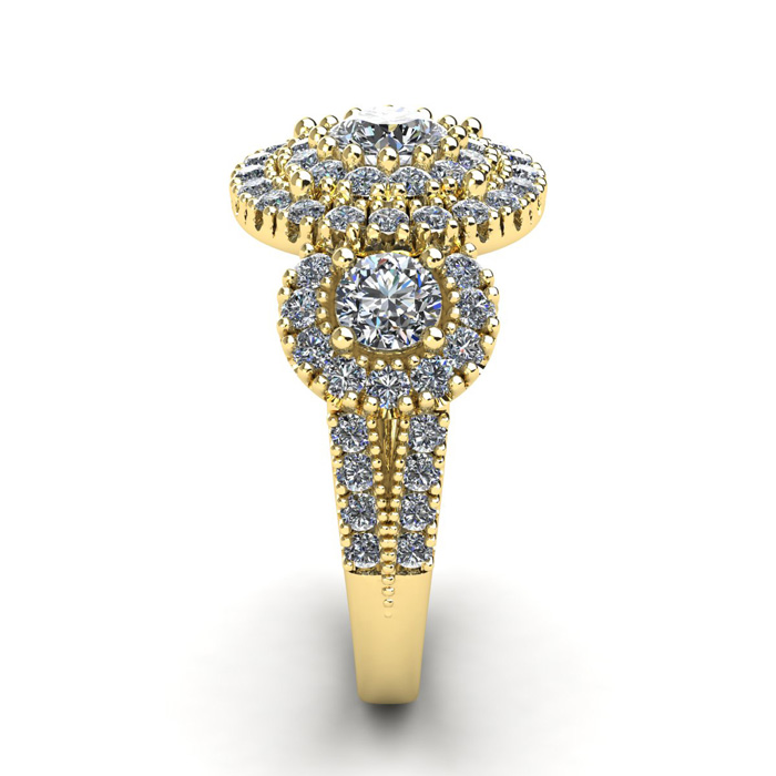 This lab grown diamond engagement ring features a 1/2 carat round shape center lab grown diamond. It is accented with 70 round lab grown diamonds in a hidden halo in G-H color, VS clarity. Total carat weight is approximately 2 carats. This ring is in 10 karat yellow gold.