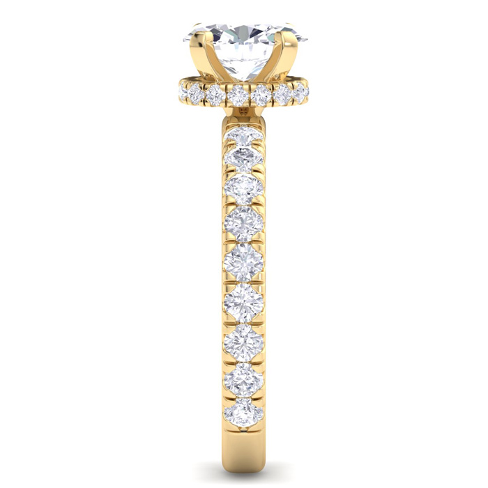 This lab grown diamond engagement ring features a 1 carat oval shape center lab grown diamond. It is accented with 33 round lab grown diamonds in a hidden halo in G-H color, VS clarity. Total carat weight is approximately 2 carats. This ring is in 14 karat yellow gold.