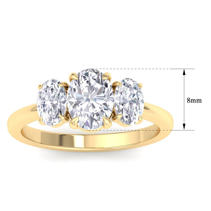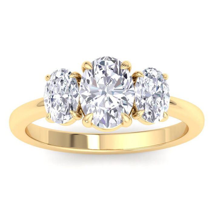 This lab grown diamond engagement ring features a 1 carat oval shape center lab grown diamond. It is accented with two oval shape lab grown diamonds in G-H color, VS clarity. Total carat weight is approximately 2 carats. This ring is in 14 karat yellow gold.
