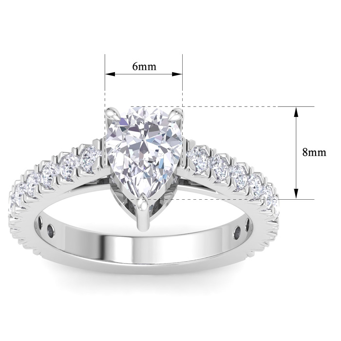 This lab grown diamond engagement ring features a 1 carat pear shape center lab grown diamond. It is accented with 18 round lab grown diamonds in G-H color, VS clarity. Total carat weight is approximately 2 carats. This ring is in 14 karat white gold.