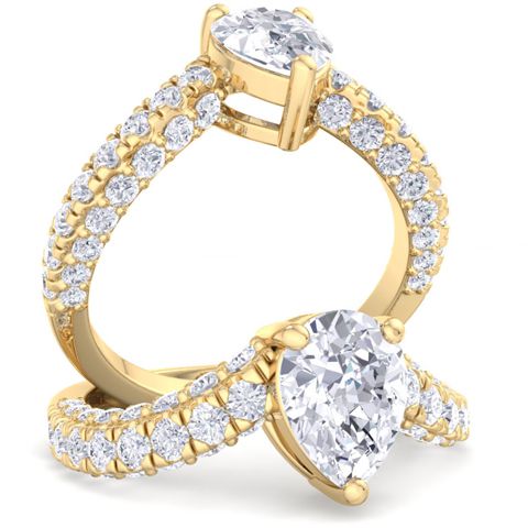 This lab grown diamond engagement ring features a 1 carat pear shape center lab grown diamond. It is accented with 48 round lab grown diamonds in G-H color, VS clarity. Total carat weight is approximately 2 carats. This ring is in 14 karat yellow gold.