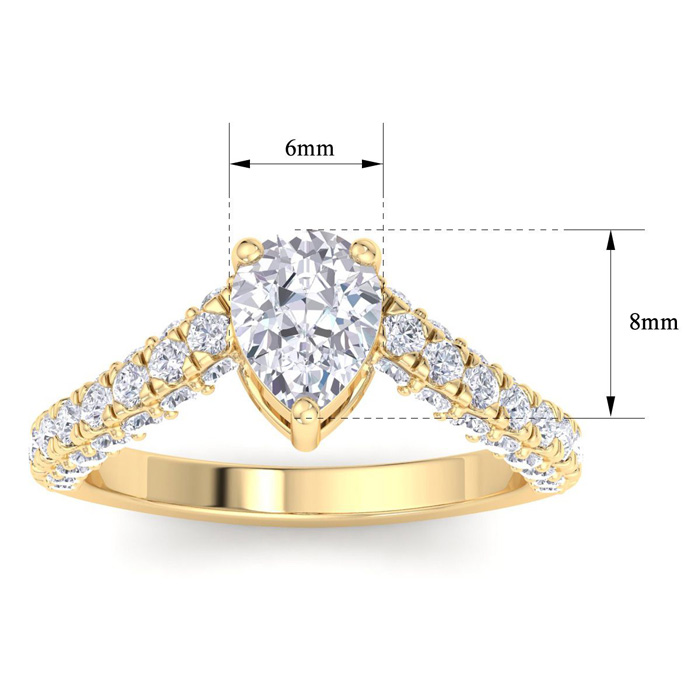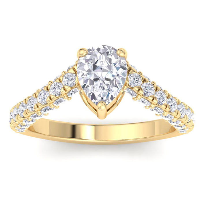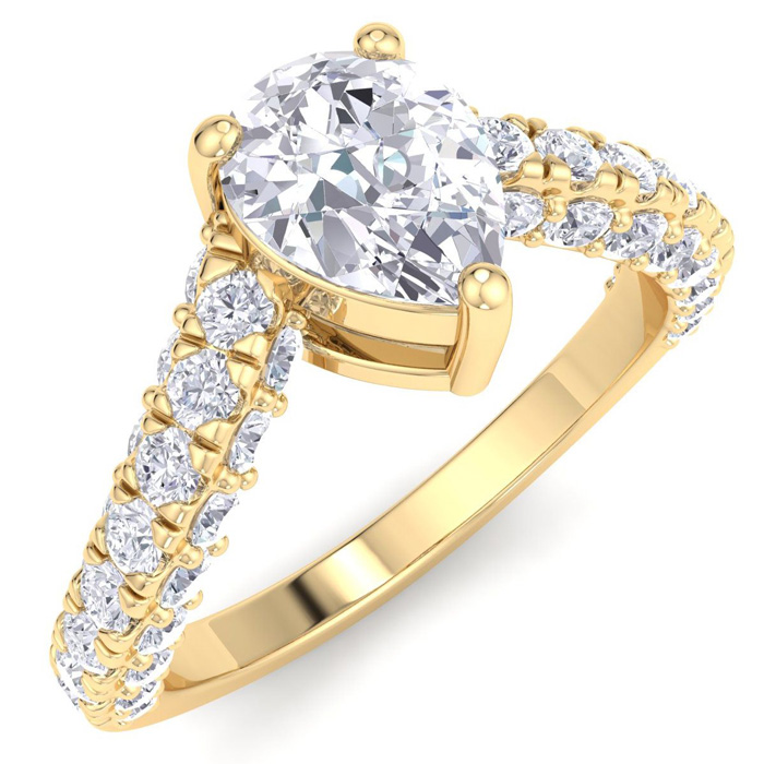 This lab grown diamond engagement ring features a 1 carat pear shape center lab grown diamond. It is accented with 48 round lab grown diamonds in G-H color, VS clarity. Total carat weight is approximately 2 carats. This ring is in 14 karat yellow gold.