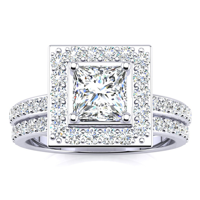 This lab grown diamond bridal set features a 1 carat princess cut center lab grown diamond. It is accented with 60 round lab grown diamonds in G-H color, VS clarity. Total carat weight is approximately 2 carats. This ring is in 14 karat white gold.