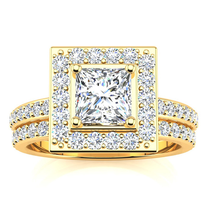 2 Carat Princess Cut Halo Lab Grown Diamond Bridal Set in 14k Yellow Gold