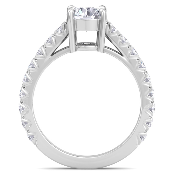 This lab grown diamond engagement ring features a 1 carat round center lab grown diamond. It is accented with 18 round lab grown diamonds in G-H color, VS clarity. Total carat weight is approximately 2 carats. This ring is in 14 karat white gold.