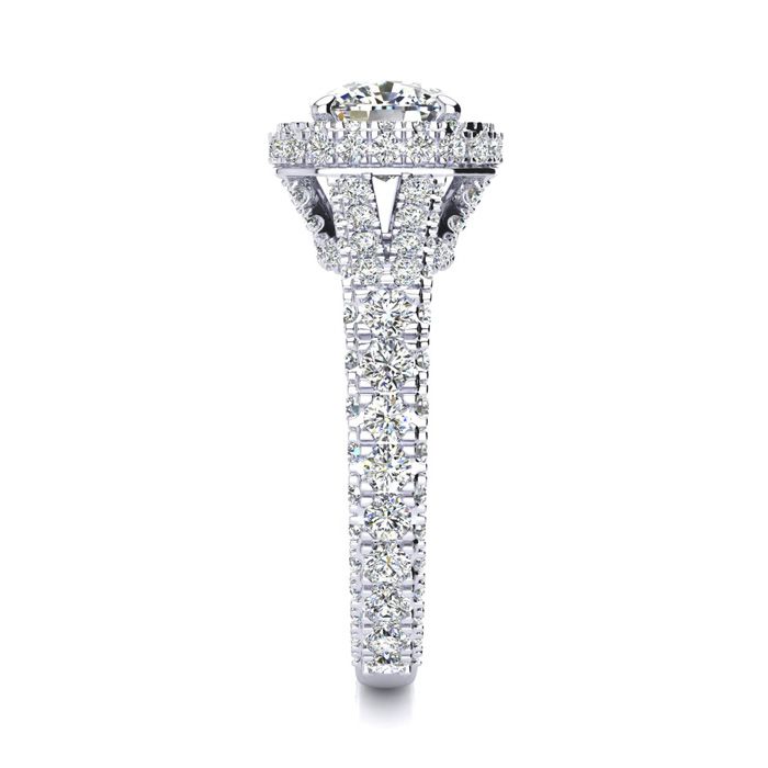 This lab grown diamond engagement ring features a 2 carat cushion cut center lab grown diamond. It is accented with 168 round lab grown diamonds in G-H color, VS clarity. Total carat weight is approximately 3 1/2 carats. This ring is in 14 karat white gold.