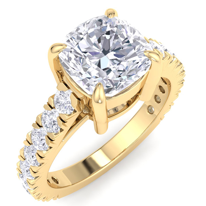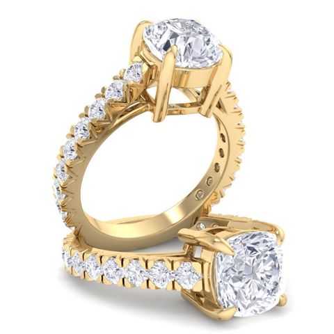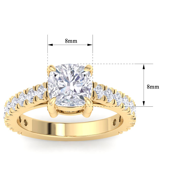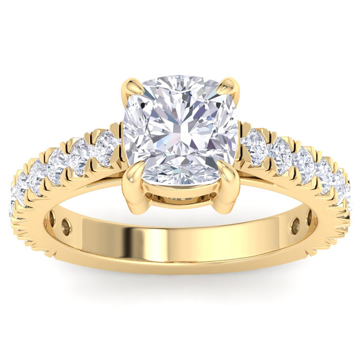 This lab grown diamond engagement ring features a 2 carat cushion cut center lab grown diamond. It is accented with 18 round lab grown diamonds in G-H color, VS clarity. Total carat weight is approximately 3 carats. This ring is in 14 karat yellow gold.