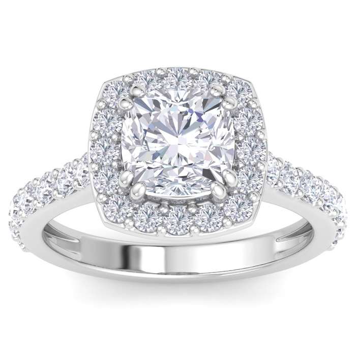 This lab grown diamond engagement ring features a 2 carat cushion cut center lab grown diamond. It is accented with 30 round lab grown diamonds in a halo in G-H color, VS3 Clarity. Total carat weight is approximately 3 carats. This ring is in 14 karat white gold.
